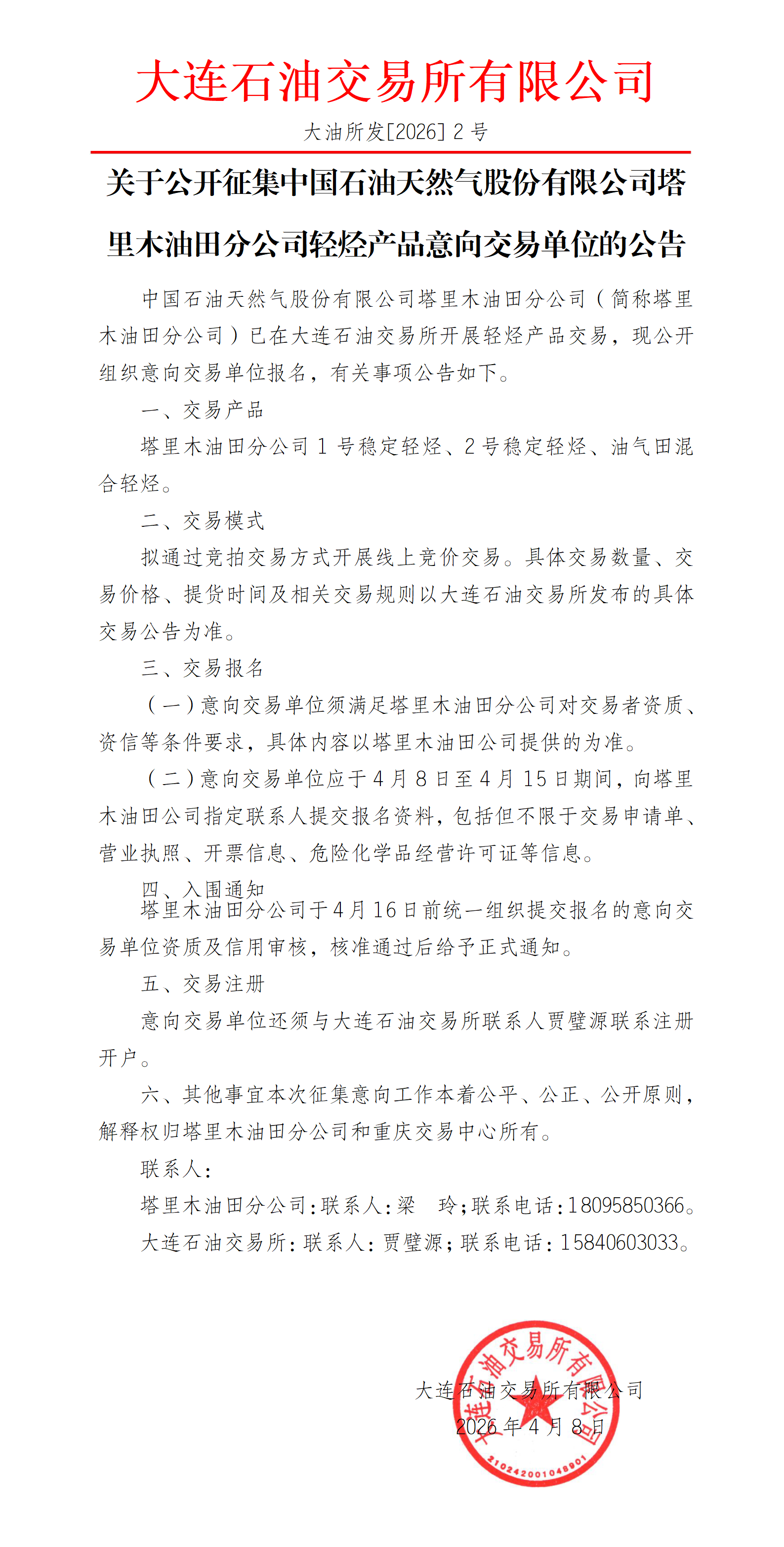 关于公开征集塔里木油田分公司轻烃产品意向交易单位的公告