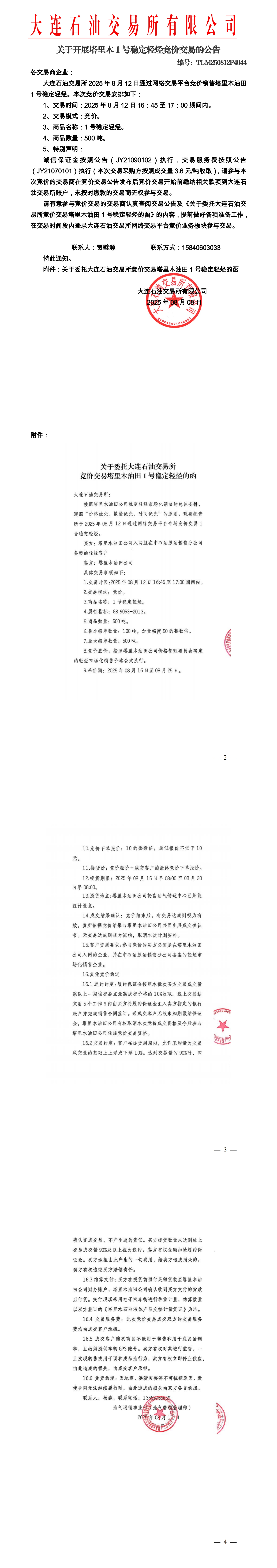 关于开展塔里木稳定轻烃竞价交易的公告(TLM250812P4044)