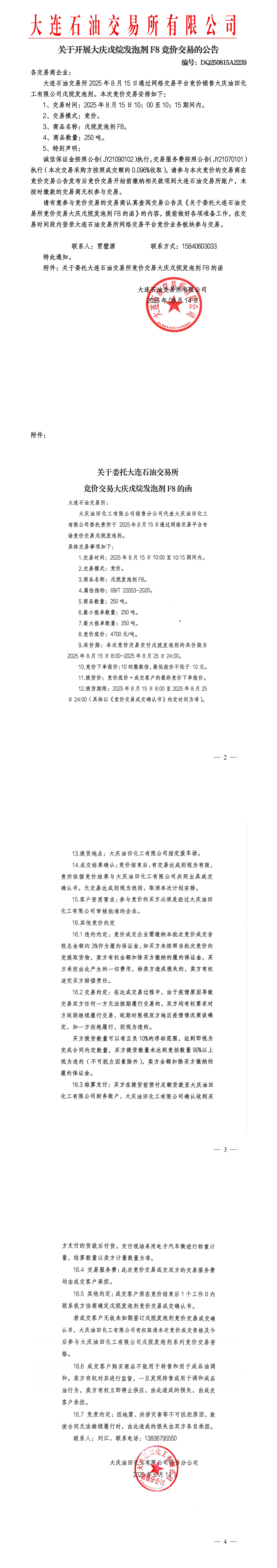 关于开展大庆戊烷发泡剂竞价交易的公告(DQ250815A2239)
