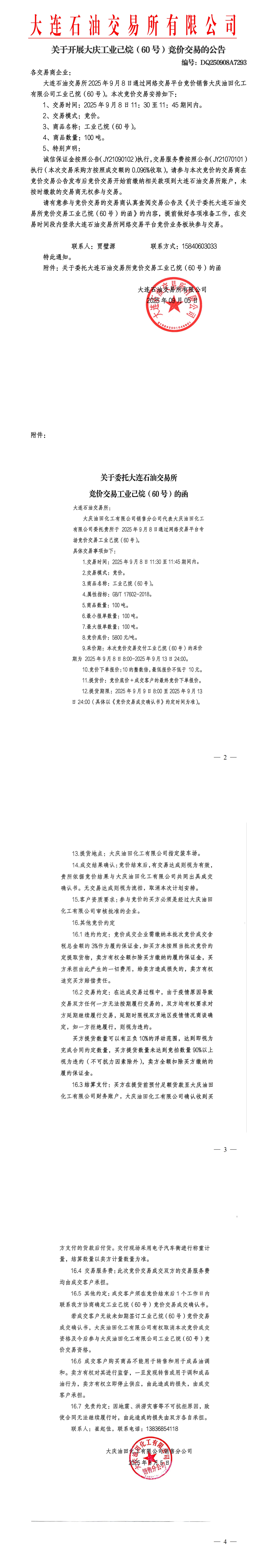 关于开展大庆工业己烷(60号)竞价交易的公告(DQ250908A7293)