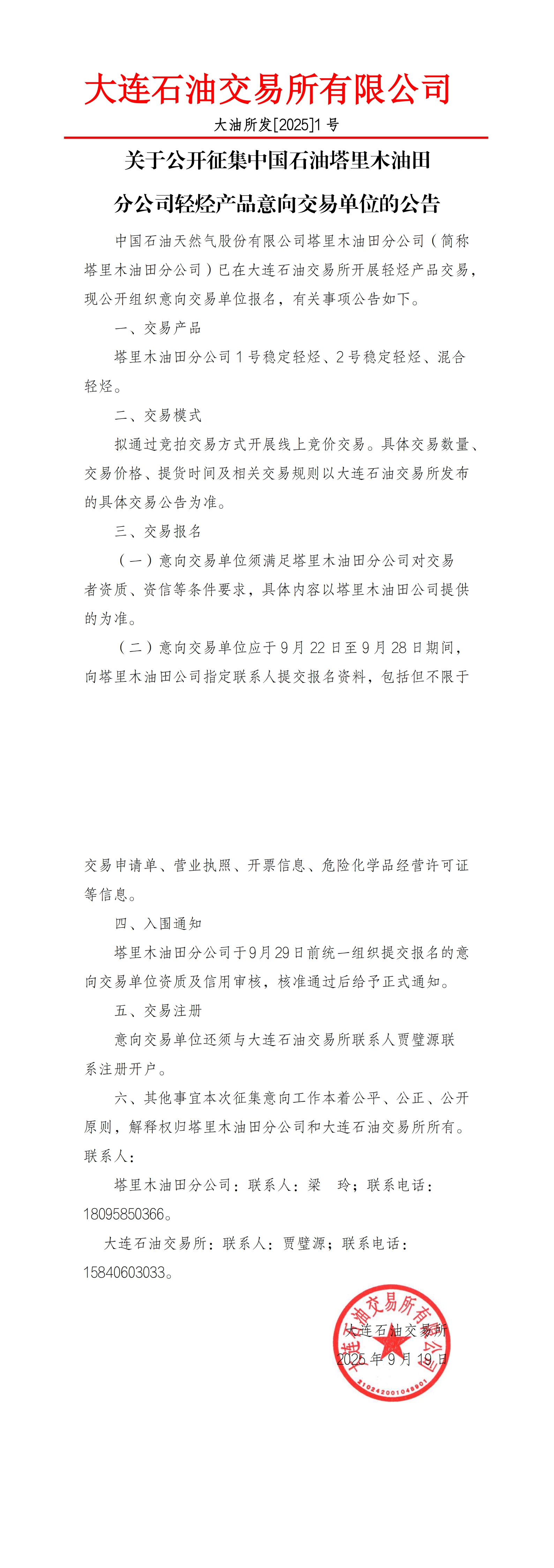 关于公开征集中国石油塔里木油田分公司轻烃产品意向交易单位的公告