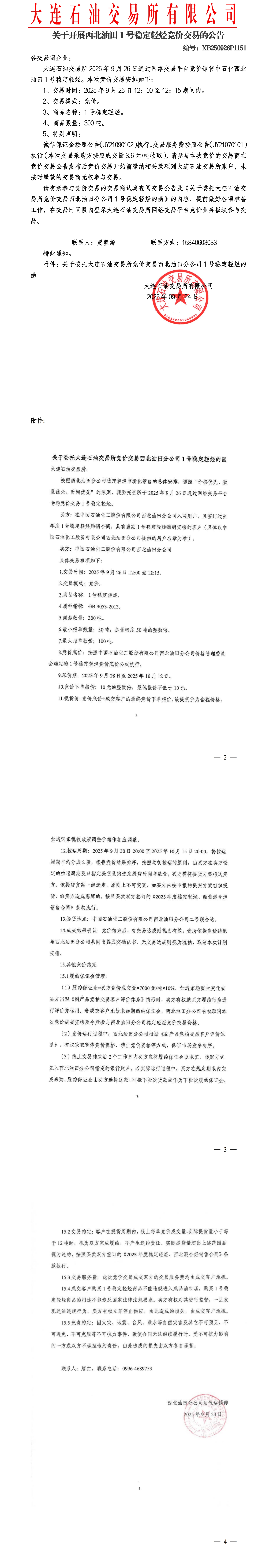 关于开展西北油田稳定轻烃竞价交易的公告(XB250926P1151)