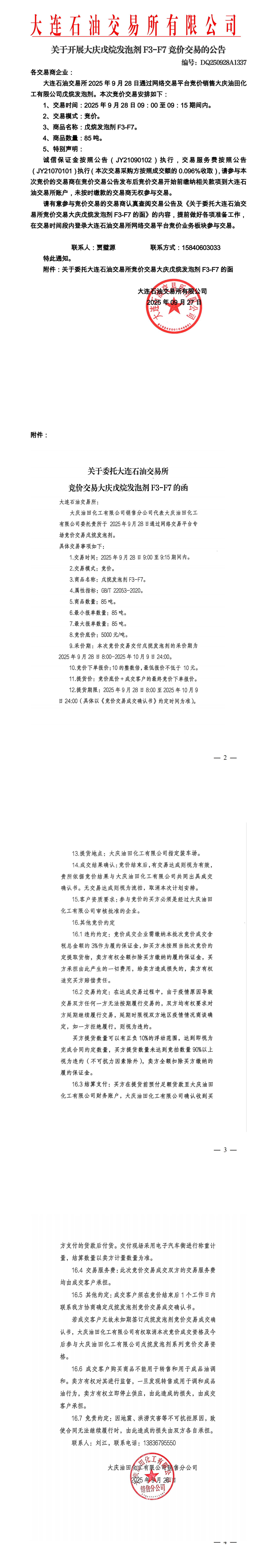 关于开展大庆戊烷发泡剂竞价交易的公告(DQ250928A1337)