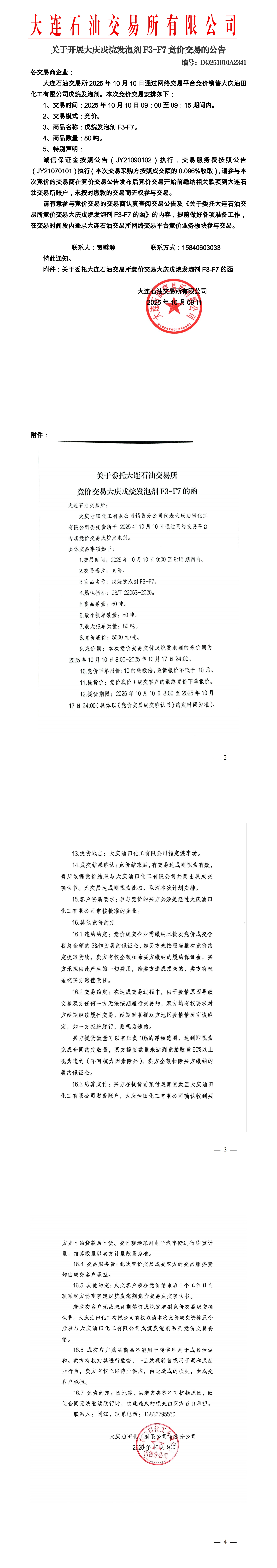 关于开展大庆戊烷发泡剂竞价交易的公告(DQ251010A2341)
