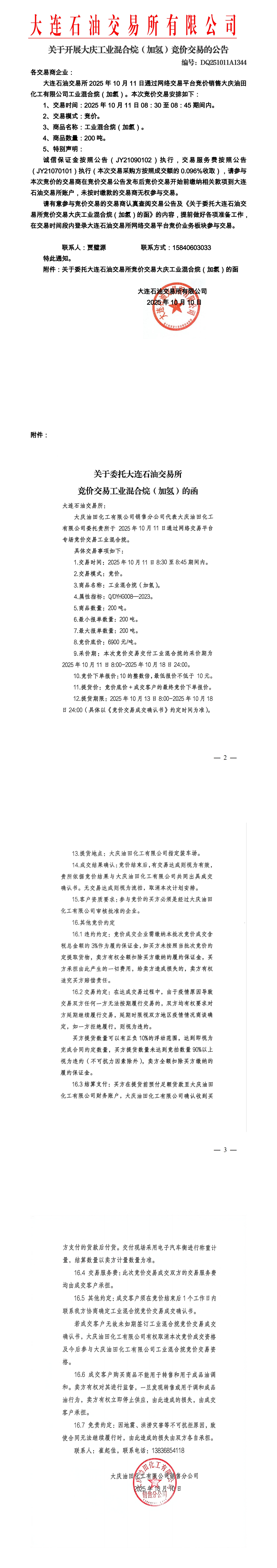 关于开展大庆工业混合烷竞价交易的公告(DQ251011A1344)