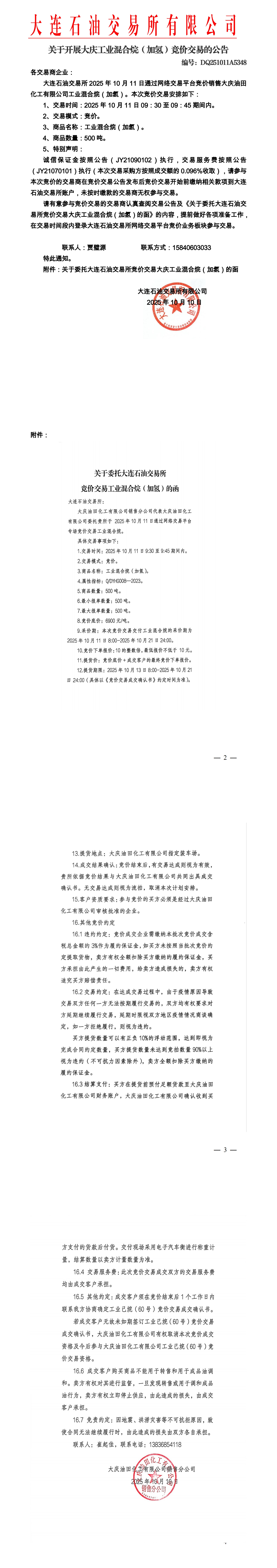 关于开展大庆工业混合烷竞价交易的公告(DQ251011A5348)