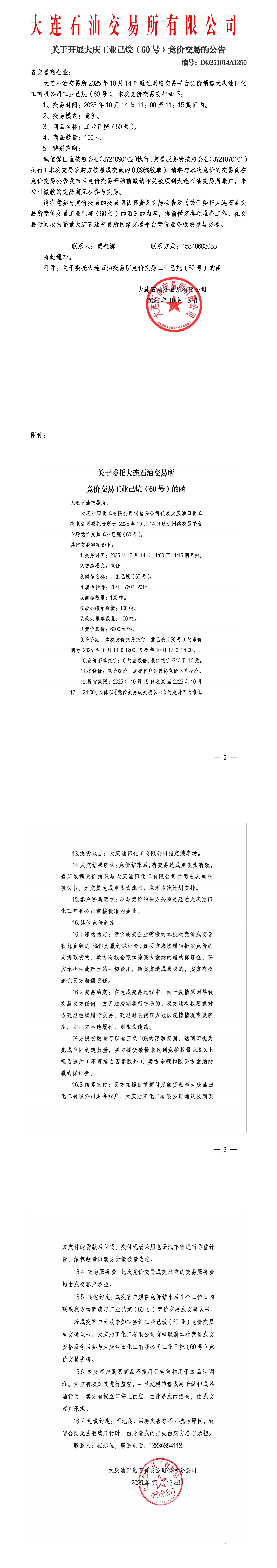 关于开展大庆工业己烷(60号)竞价交易的公告(DQ251014A1350)