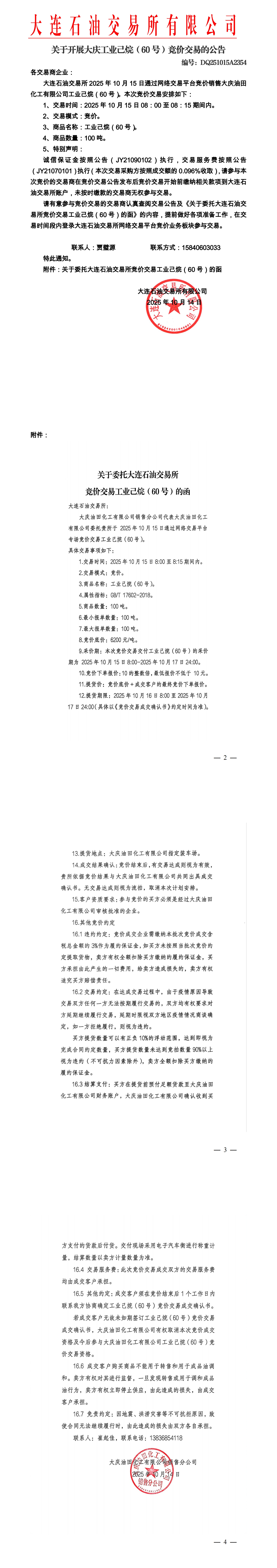 关于开展大庆工业己烷(60号)竞价交易的公告(DQ251015A2354)