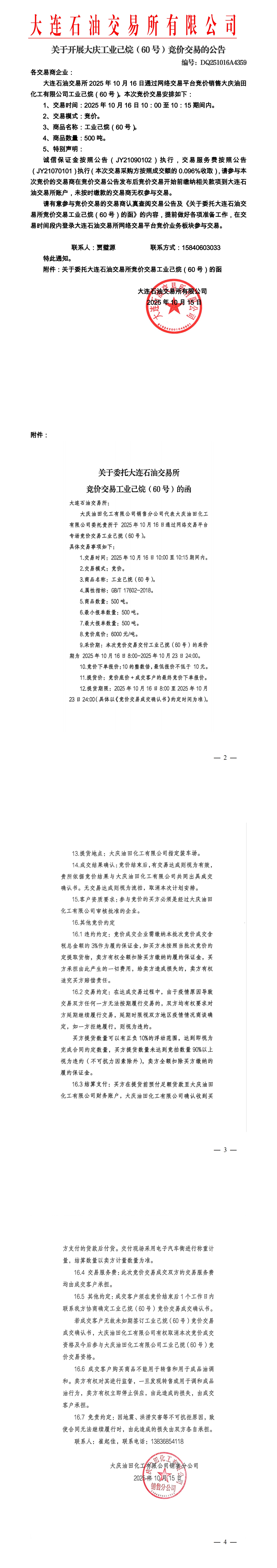 关于开展大庆工业己烷(60号)竞价交易的公告(DQ251016A4359)