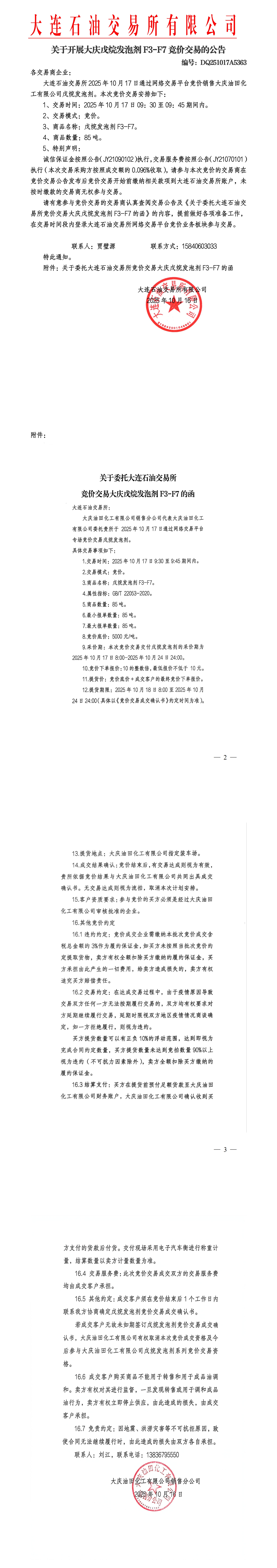 关于开展大庆戊烷发泡剂竞价交易的公告(DQ251017A5363)