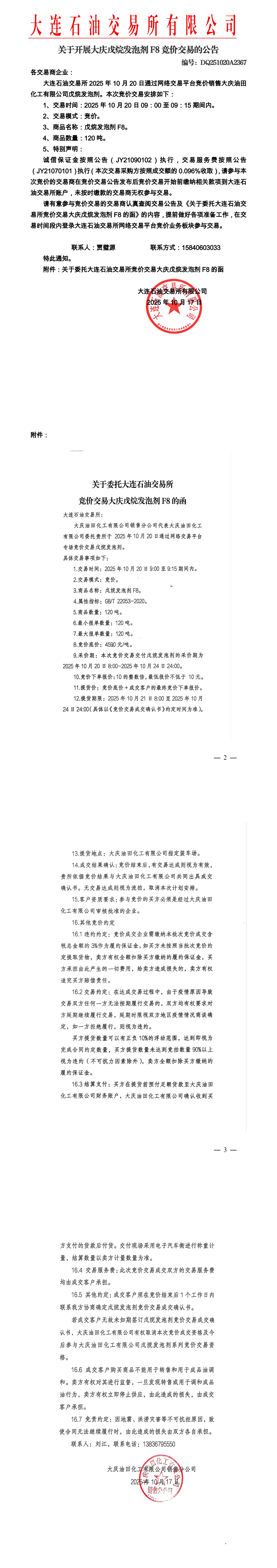 关于开展大庆戊烷发泡剂竞价交易的公告(DQ251020A2367)