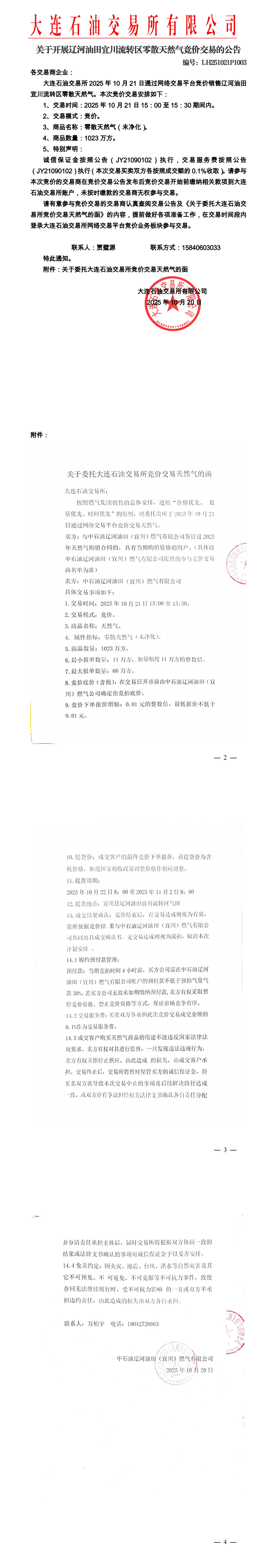 关于开展辽河油田零散天然气竞价交易的公告(LH251021P1003)