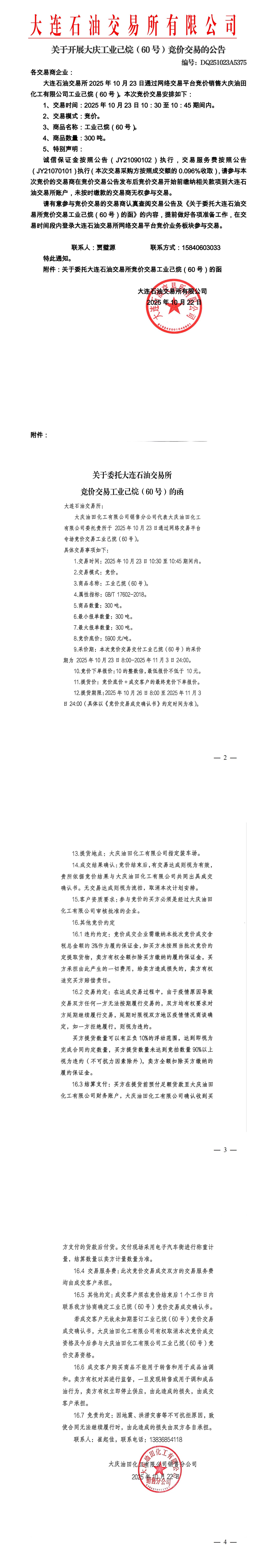 关于开展大庆工业己烷(60号)竞价交易的公告(DQ251023A5375)