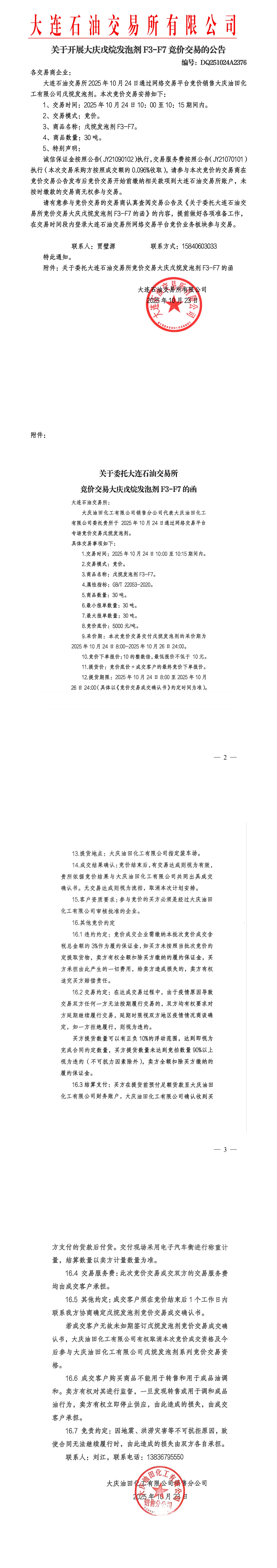 关于开展大庆戊烷发泡剂竞价交易的公告(DQ251024A2376)
