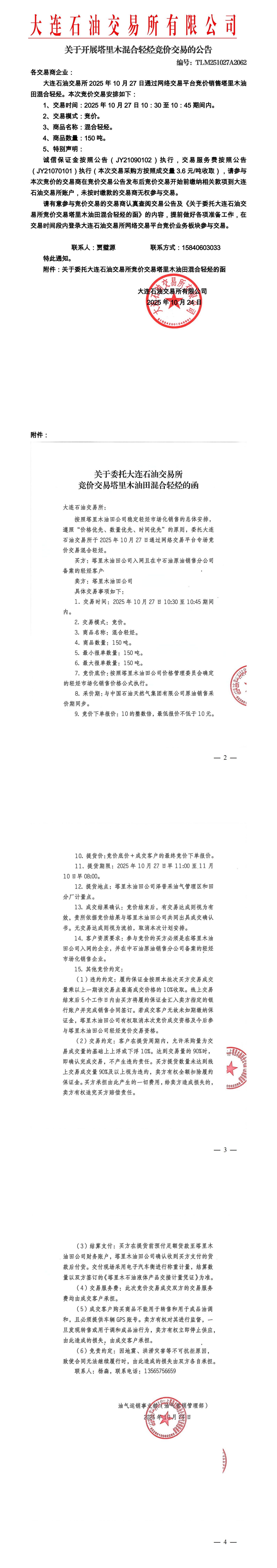 关于开展塔里木混合轻烃竞价交易的公告(TLM251027A2062)