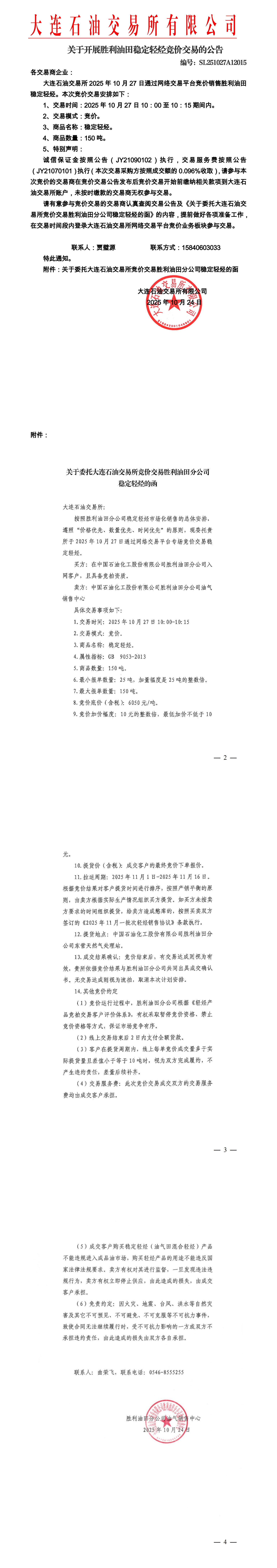 关于开展胜利油田稳定轻烃竞价交易的公告(SL251027A12015)
