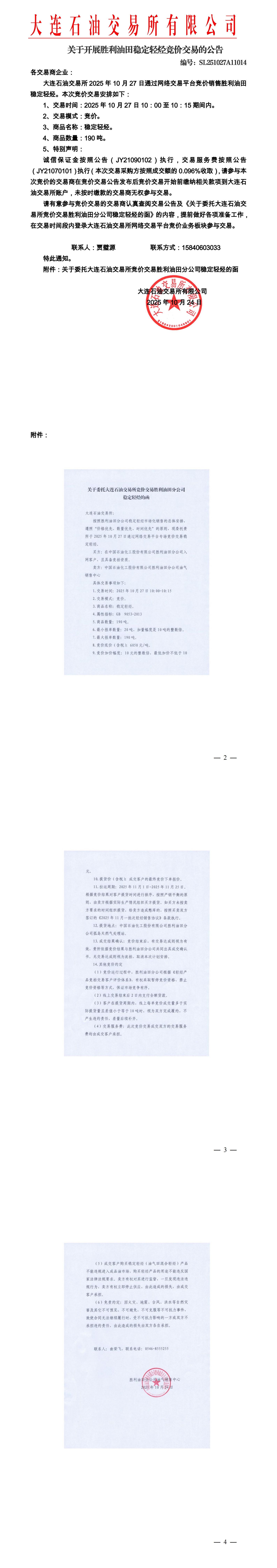 关于开展胜利油田稳定轻烃竞价交易的公告(SL251027A11014)