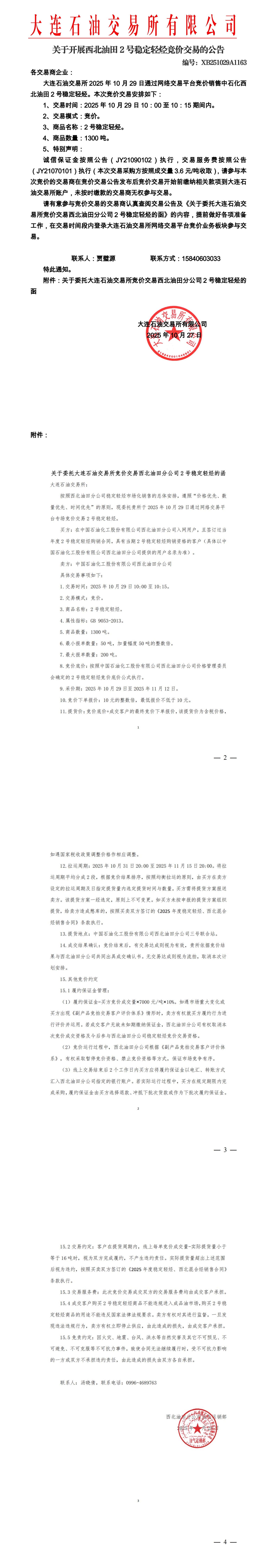 关于开展西北油田稳定轻烃竞价交易的公告(XB251029A1163)