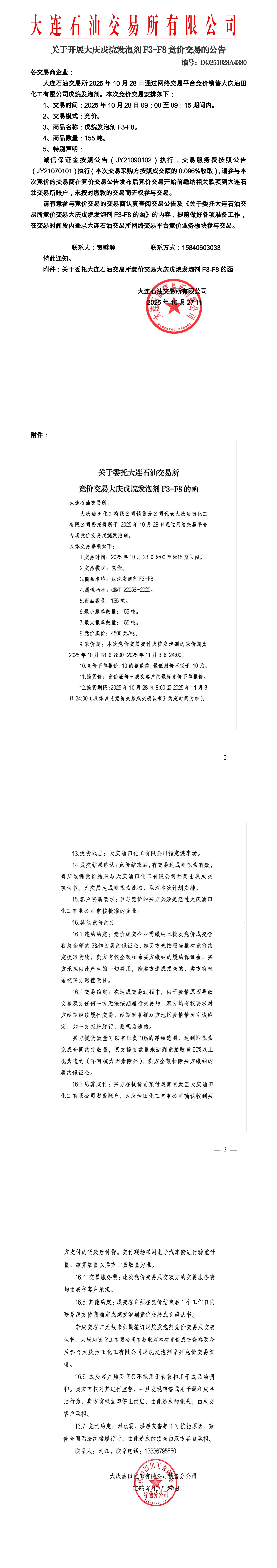 关于开展大庆戊烷发泡剂竞价交易的公告(DQ251028A4380)