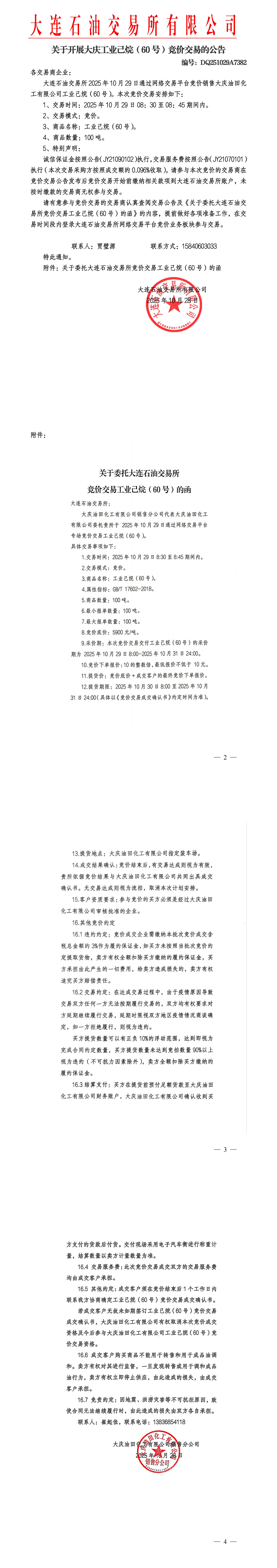 关于开展大庆工业己烷(60号)竞价交易的公告(DQ251029A7382)