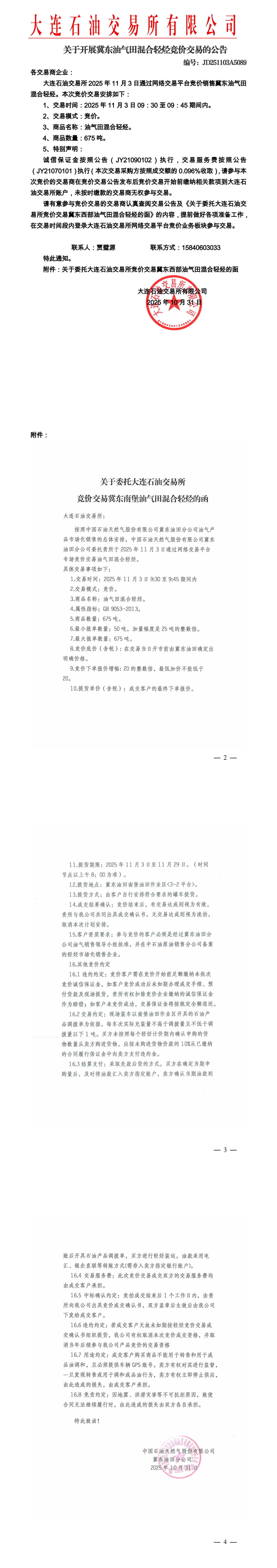 关于开展冀东油气田混合轻烃竞价交易的公告(JD251103A5089)