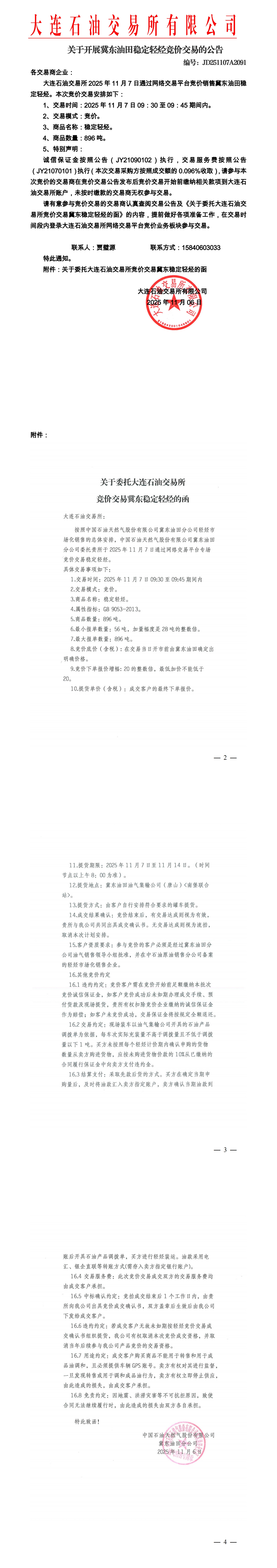 关于开展冀东油田稳定轻烃竞价交易的公告(JD251107A2091)