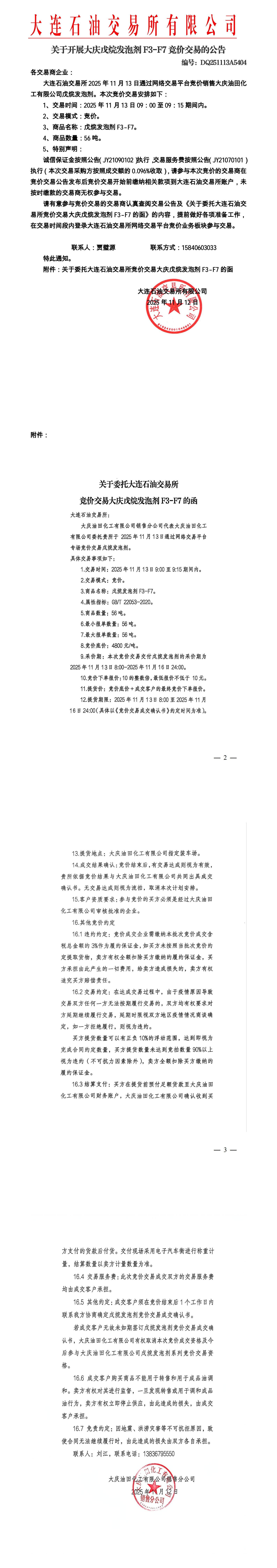 关于开展大庆戊烷发泡剂竞价交易的公告(DQ251113A5404)