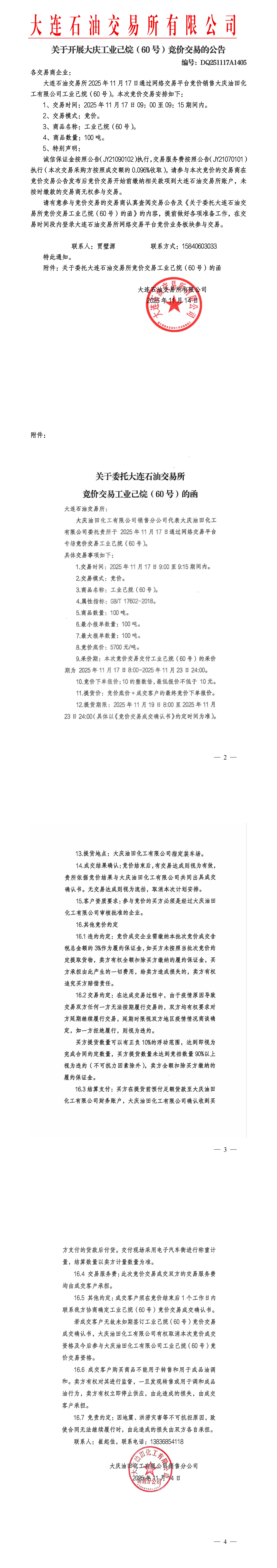 关于开展大庆工业己烷(60号)竞价交易的公告(DQ251117A1405)