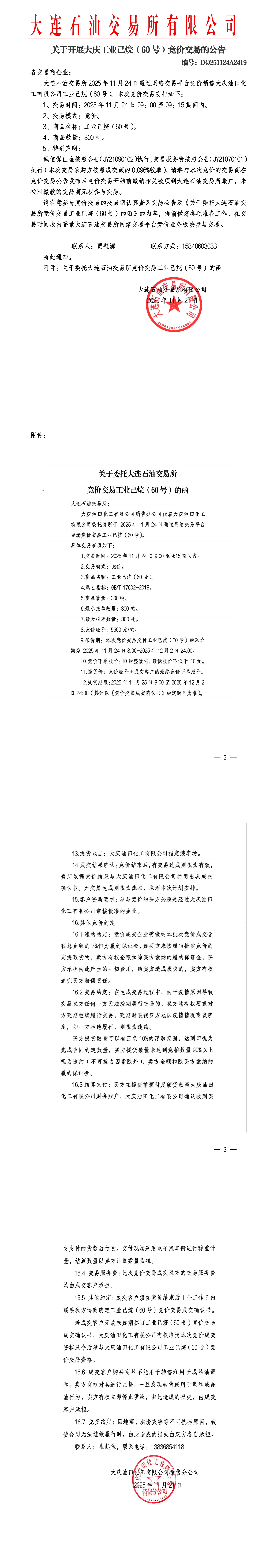 关于开展大庆工业己烷(60号)竞价交易的公告(DQ251124A2419)