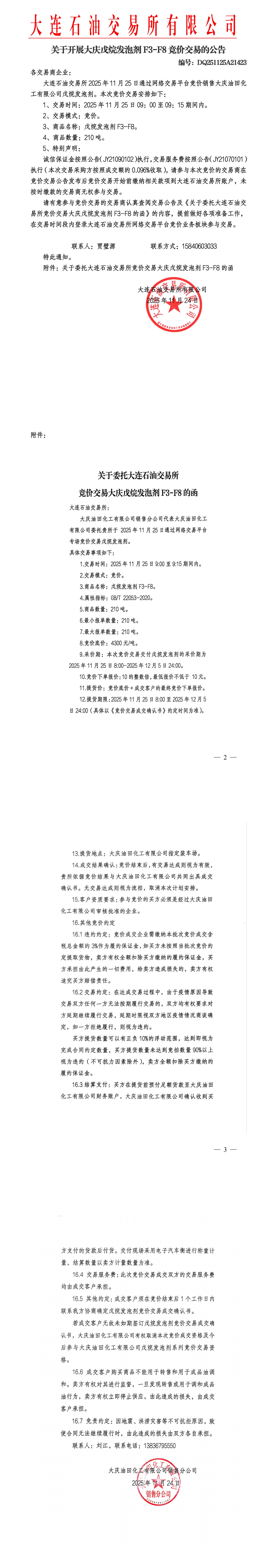 关于开展大庆戊烷发泡剂竞价交易的公告(DQ251125A21423)