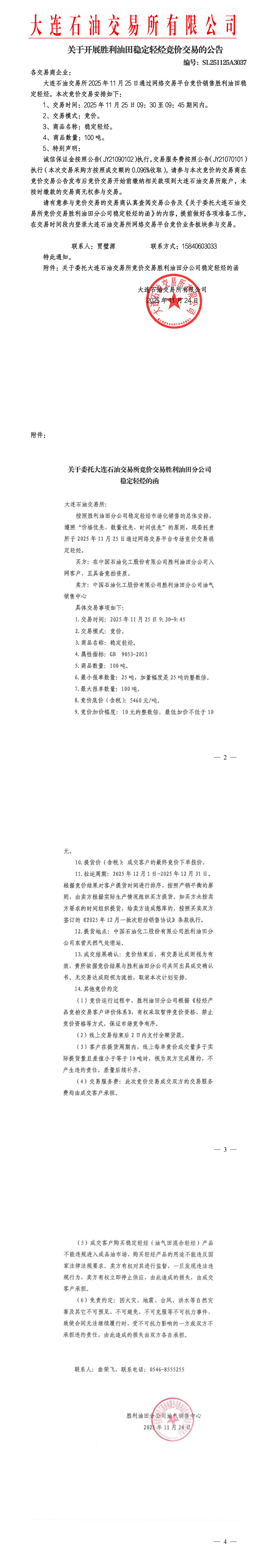 关于开展胜利油田稳定轻烃竞价交易的公告(SL251125A3037)