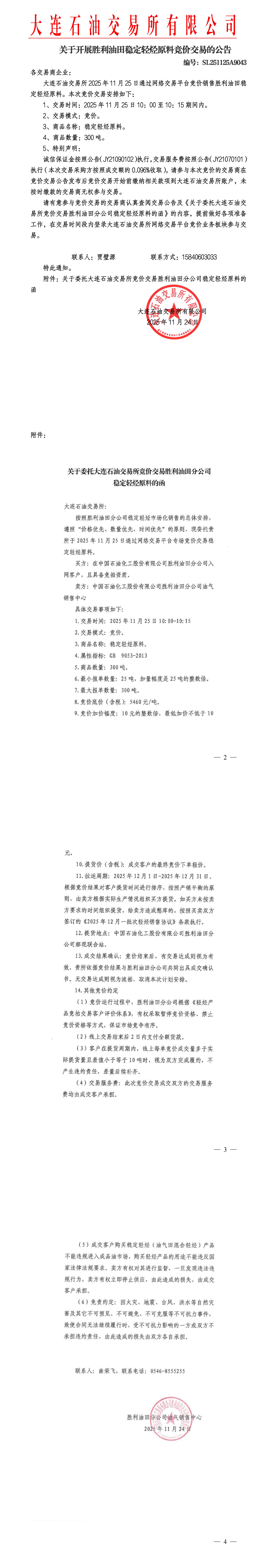 关于开展胜利油田稳定轻烃原料竞价交易的公告(SL251125A9043)