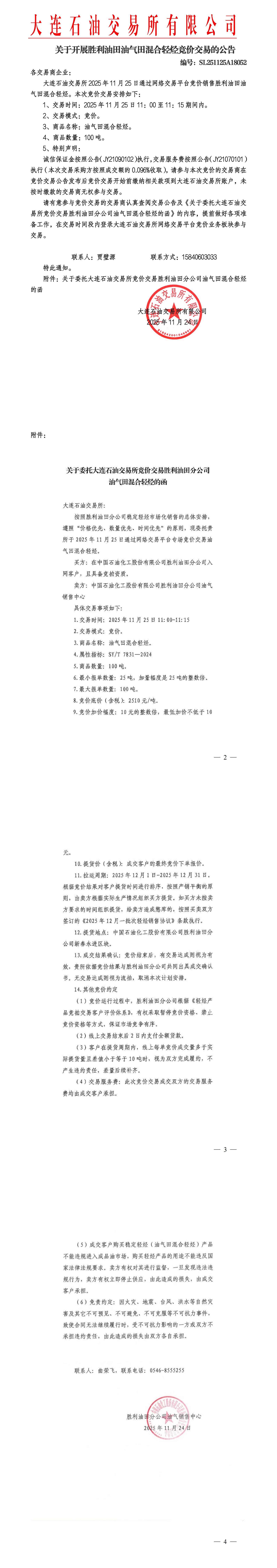 关于开展胜利油田油气田混合轻烃竞价交易的公告(SL251125A18052)