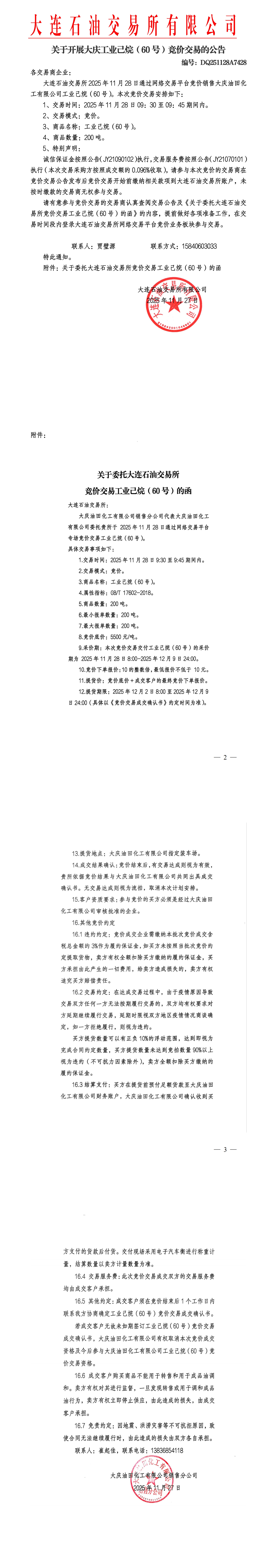 关于开展大庆工业己烷(60号)竞价交易的公告(DQ251128A7428)