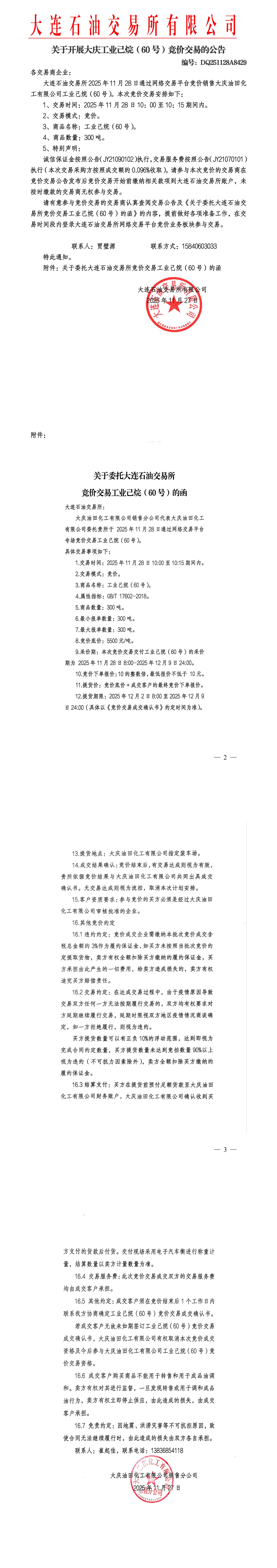 关于开展大庆工业己烷(60号)竞价交易的公告(DQ251128A8429)