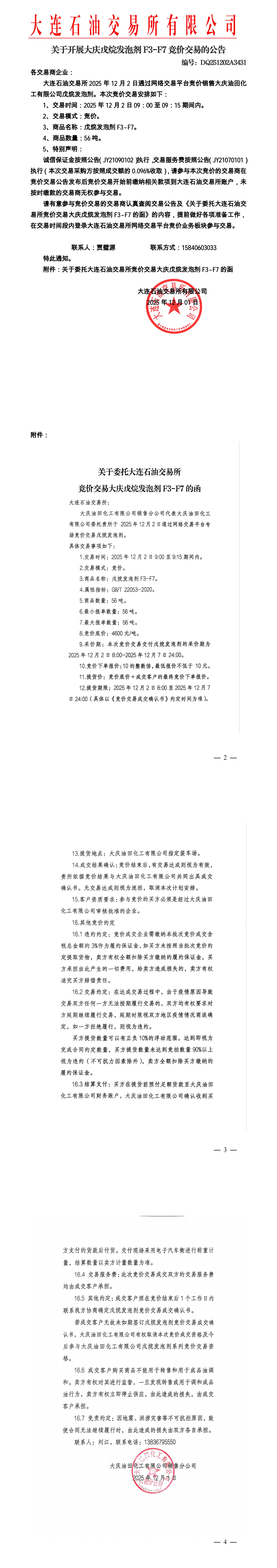 关于开展大庆戊烷发泡剂竞价交易的公告(DQ251202A3431)