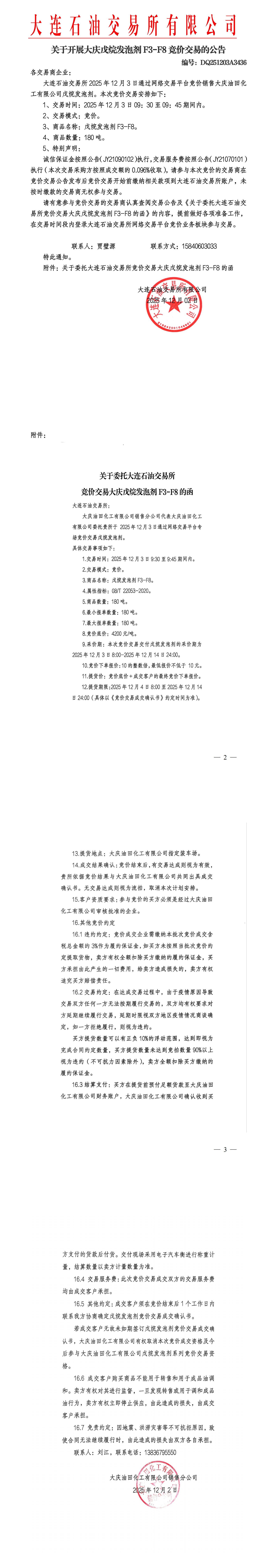 关于开展大庆戊烷发泡剂竞价交易的公告(DQ251203A30436)