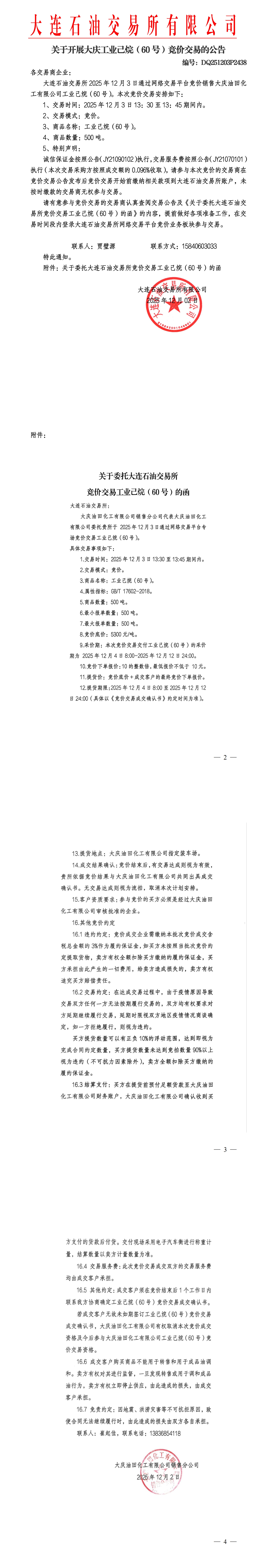 关于开展大庆工业己烷(60号)竞价交易的公告(DQ251203P2438)