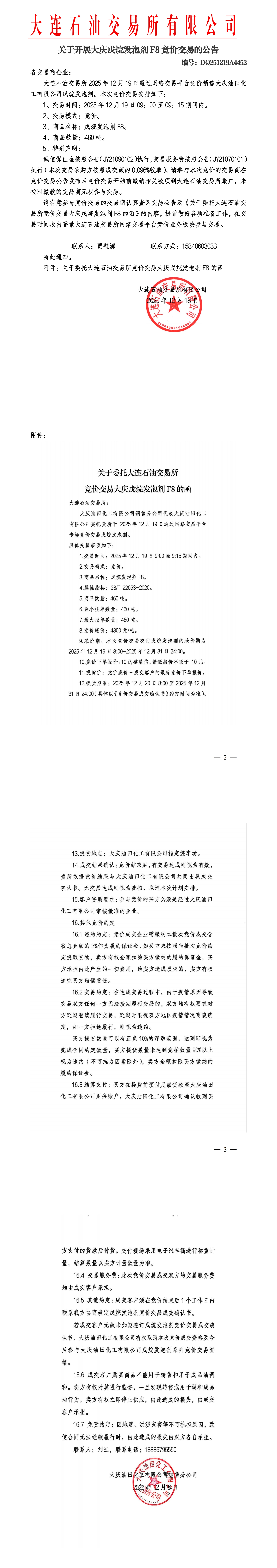 关于开展大庆戊烷发泡剂竞价交易的公告(DQ251219A4452)
