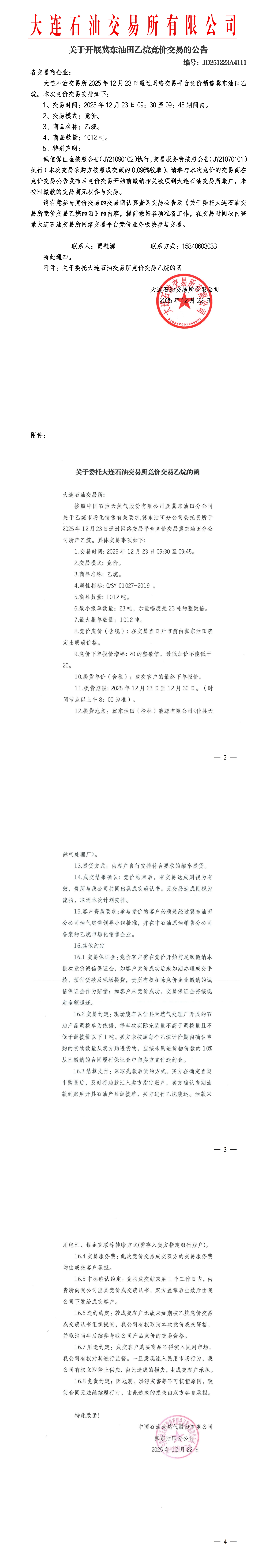 关于开展冀东油田乙烷竞价交易的公告(JD251223A4111)