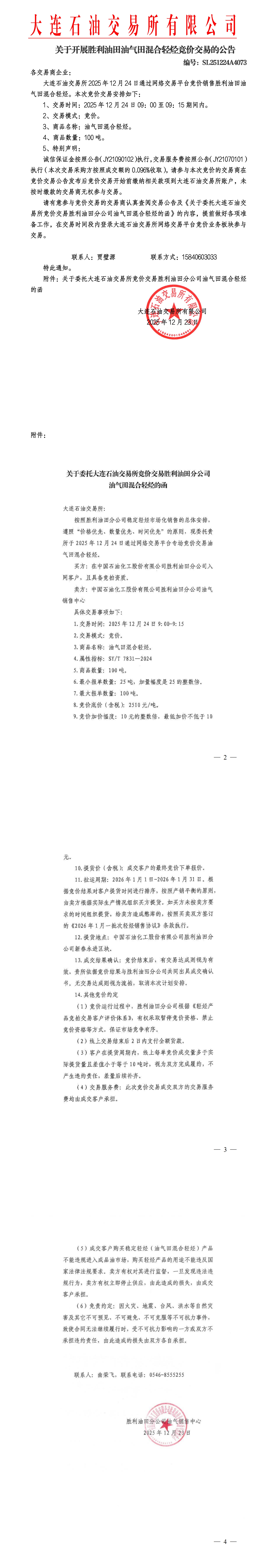 关于开展胜利油田油气田混合轻烃竞价交易的公告(SL251224A4073)