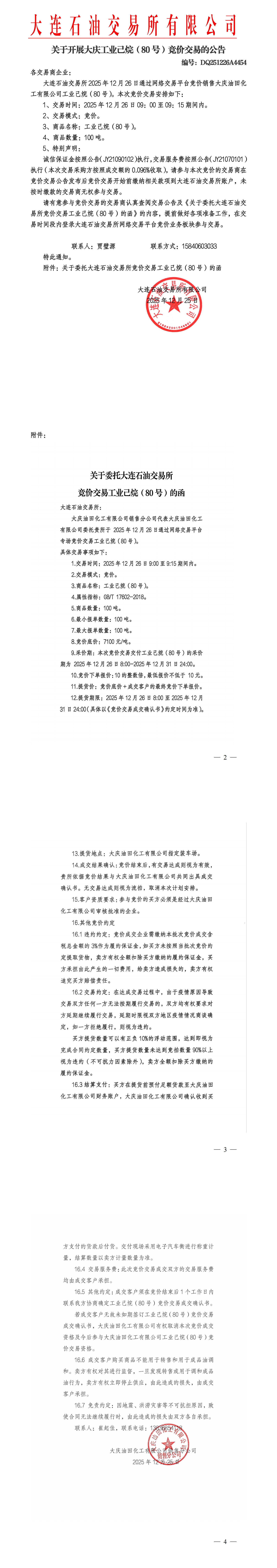 关于开展大庆工业己烷(80号)竞价交易的公告(DQ251226A4454)