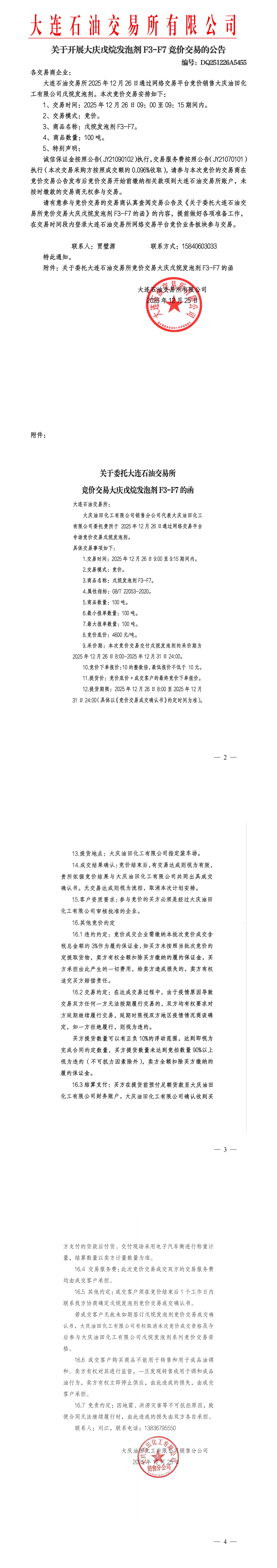 关于开展大庆戊烷发泡剂竞价交易的公告(DQ251226A5455)