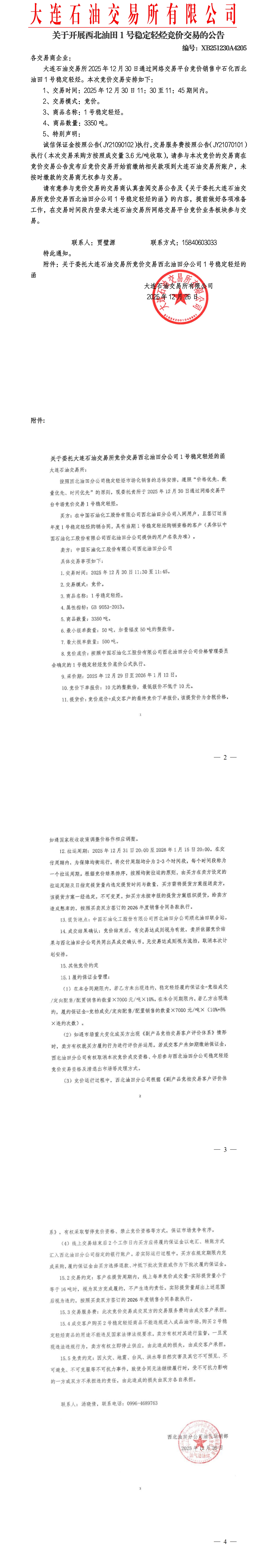 关于开展西北油田稳定轻烃竞价交易的公告(XB251230A4205)