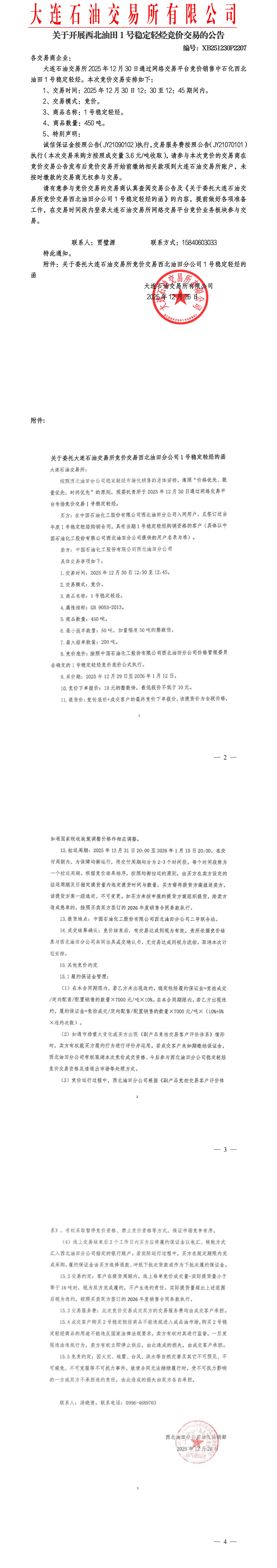 关于开展西北油田稳定轻烃竞价交易的公告(XB251230P2207)