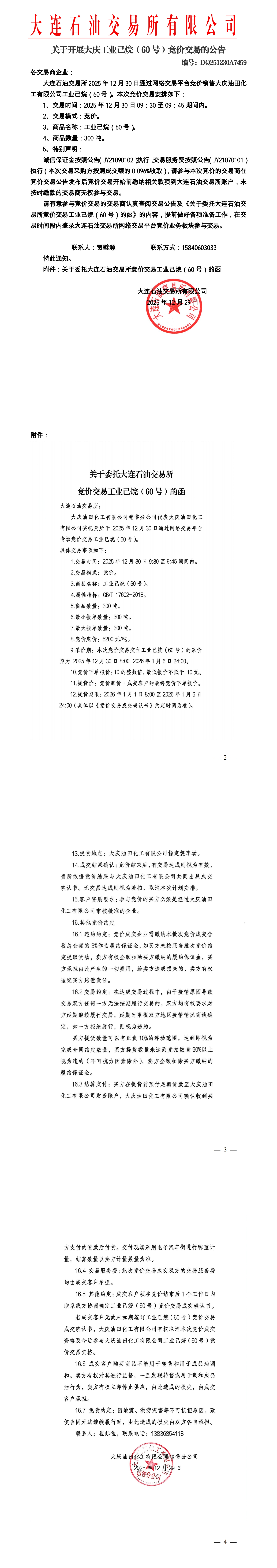 关于开展大庆工业己烷(60号)竞价交易的公告(DQ251230A7459)