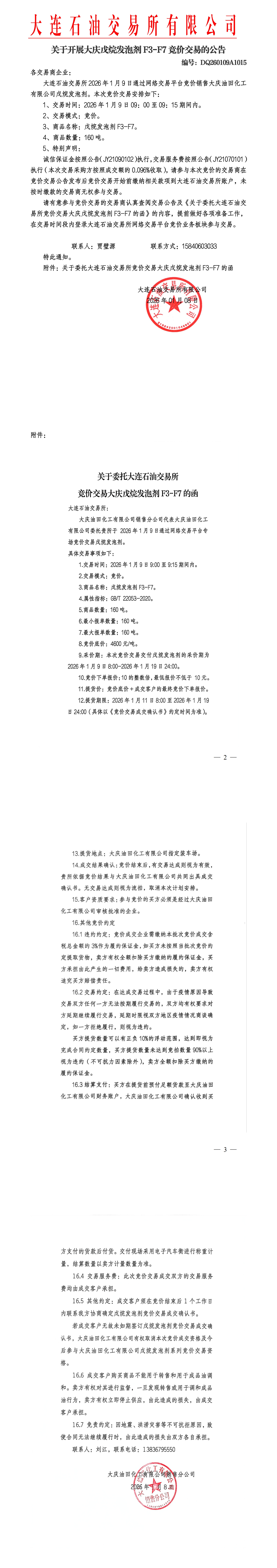 关于开展大庆戊烷发泡剂竞价交易的公告(DQ260109A1015)