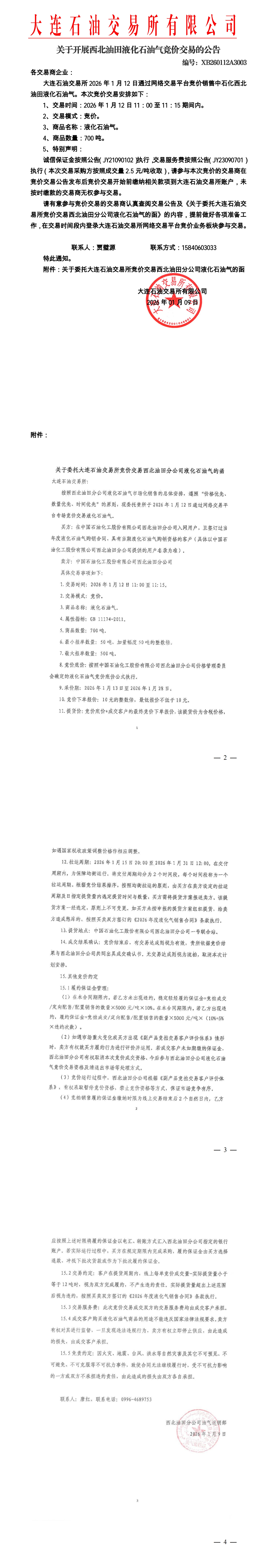 关于开展西北油田液化石油气竞价交易的公告(XB260112A3003)