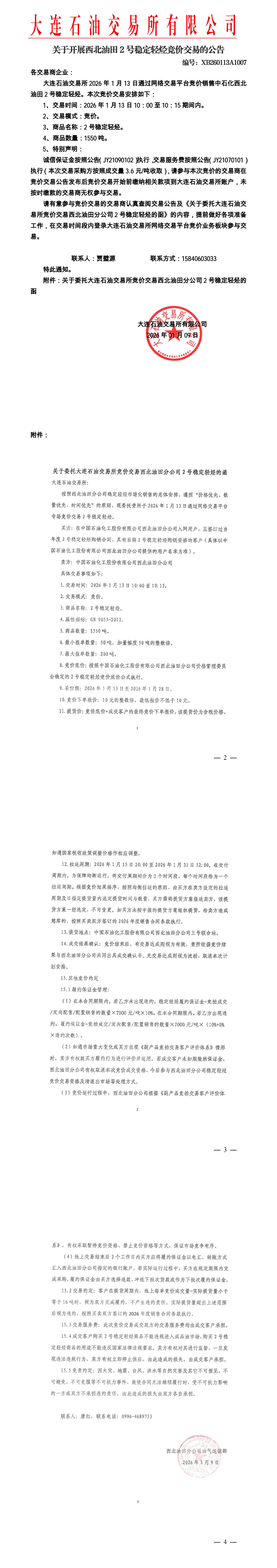 关于开展西北油田稳定轻烃竞价交易的公告(XB260113A1007)