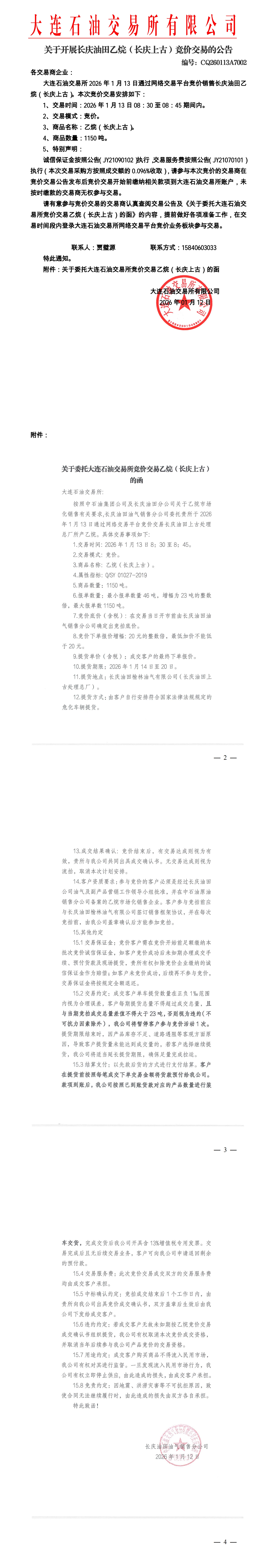 关于开展长庆油田乙烷(长庆上古)竞价交易的公告(CQ260113A7002)